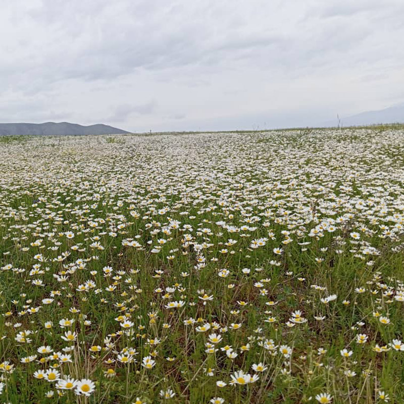 دشتی پوشیده از گلهای بابونه در هوایی ابری، منظرهای آرام و روستایی را به تصویر کشیده است.