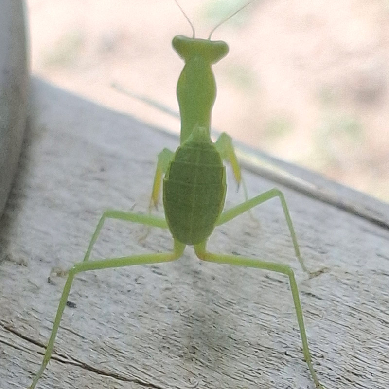 حشره‌ی سبز دعاخوان روی طاقچه‌ی چوبی در فضای روستایی نشسته، آماده‌ی شکار یا استتار در طبیعت.