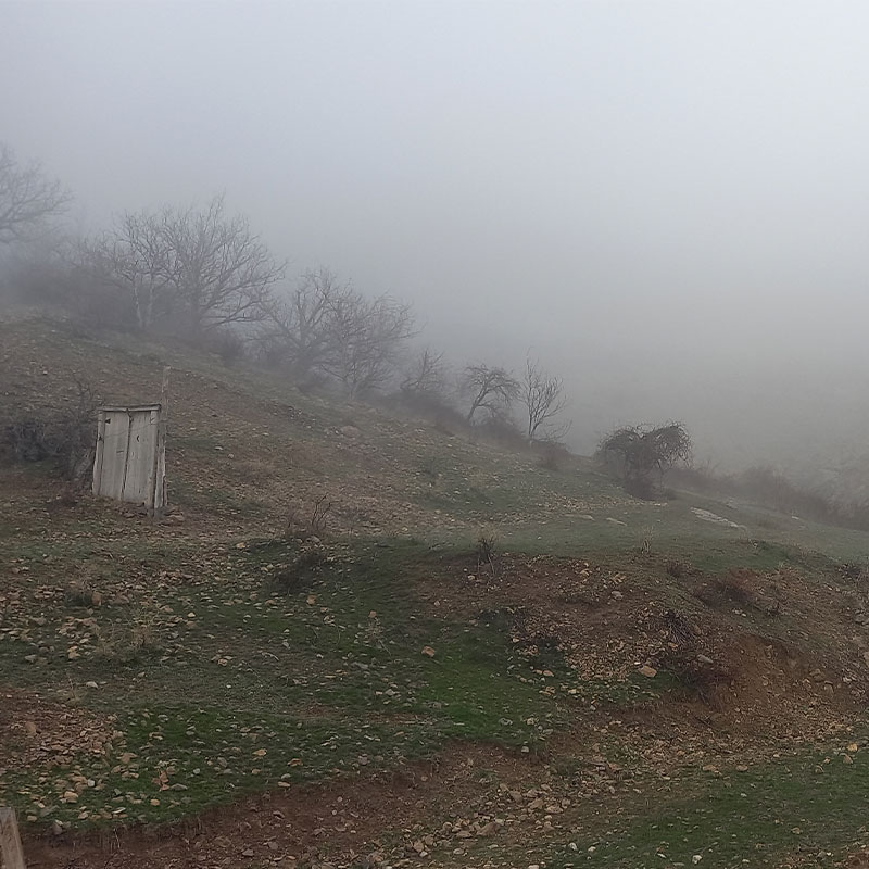 سکوت مه‌آلود در دامنه کوه – درختان خشک و کلبه چوبی گمشده در مه